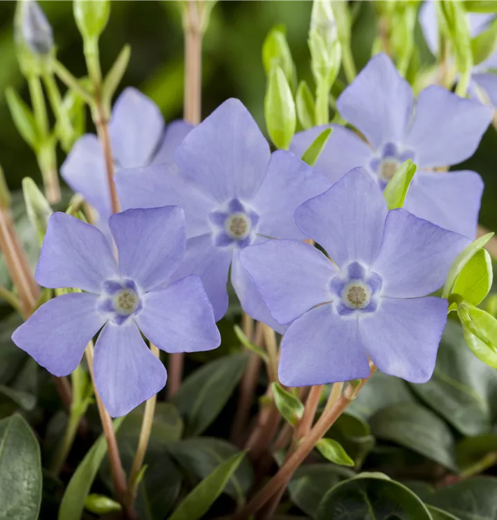 Vinca minor bildet radförmige, blaue Blüten ab Mai. Bei richtiger Pflege Nachblüte im September.