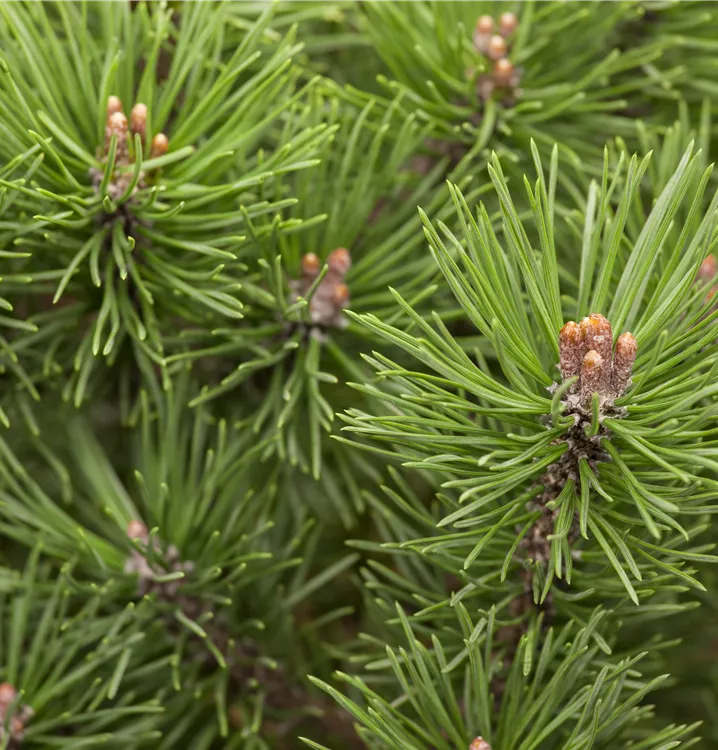 Ihre nadelförmigen Blätter haben eine mittelgrüne Färbung. Dekorative braun-gelbe Zapfen zieren Pinus mugo 'Mops' ab Oktober. Dieses Gehölz ist gut frostverträglich. Sie bevorzugt einen sonnigen bis halbschattigen Standort. An den Boden stellt die Kugel-Kiefer 'Mops' keine besonderen Ansprüche.