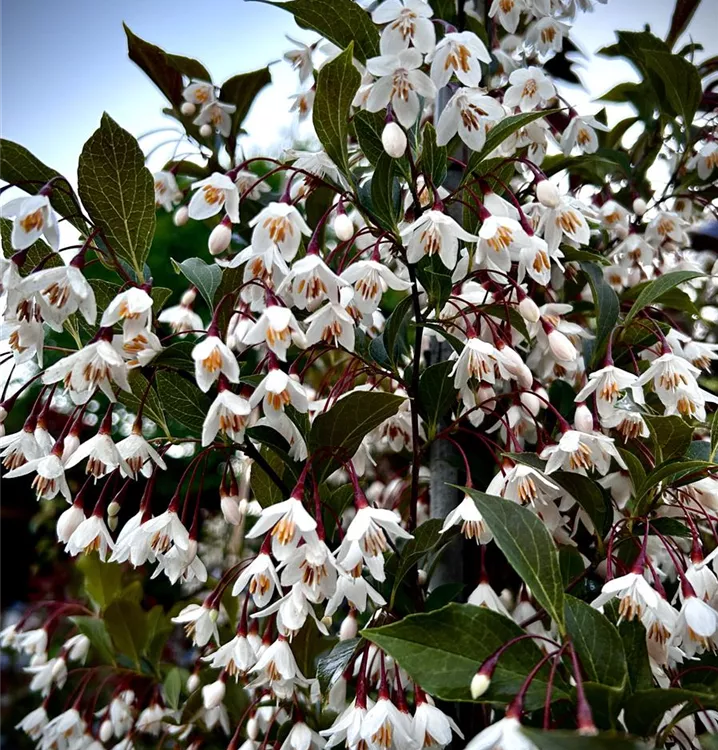 Der Japanische Storaxbaum 'Evening Light' (Styrax japonicus) ist ein breiter, verzweigter Großstrauch mit dekorativen, cremeweißen, ovalen Früchten. Diese verströmen einen angenehmen Duft. Diesen voraus bringt er von Juni bis Juli weiße, glockenförmige, in Trauben angeordnete Blüten hervor. Zudem trägt der Japanische Storaxbaum 'Evening Light', eiförmige, dunkelgrüne, dunkelrot gezeichnete Blätter. An einem halbschattigen, windgeschützten Standort mit durchlässigem, humosem, schwachsaurem Boden erreicht er gewöhnlich eine Höhe von ca. 8 m und wird ca. 8 m breit.