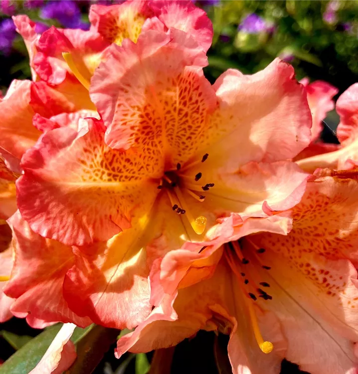Rhododendron 'Sun Fire' bildet von Mai bis Juni zahlreiche trichterförmige, in Dolden angeordnete, mehrfarbige Blüten.