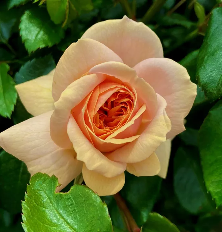 Die sommergrünen Blätter der Beetrose 'Garden of Roses'® sind dunkelgrün, gefiedert, wechselständig.