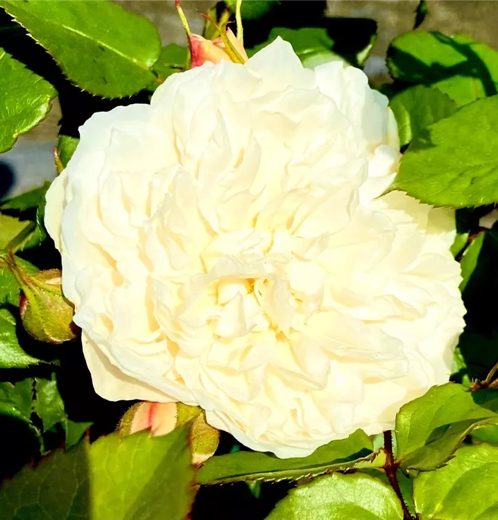Die Strauchrose 'William and Catherine'® bildet cremeweiße, stark duftende, starkgefüllte Blüten von Juni bis September.