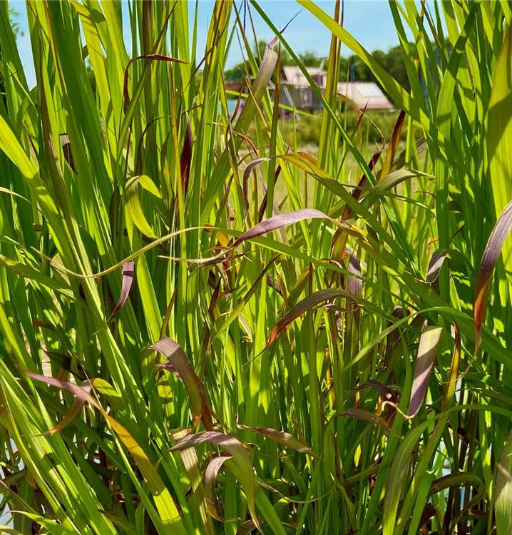 Das Garten-Chinaschilf 'Purpurascens' (Miscanthus sinensis) ist mit seiner mittelgrünen Blattfärbung ein dekoratives Gestaltungselement im Garten, welches sich an einem sonnigen bis halbschattigen Standort mit einem möglichst durchlässigen, humosen, nährstoffreichen Boden am wohlsten fühlt. Die silberweißen Blütenwedel schmücken die aufrecht wachsende Pflanze ab Sommer. Bei günstigen Bedingungen erreicht dieses winterharte Gras eine Höhe von ca. 1,3 m und wird bis zu 1 m breit.