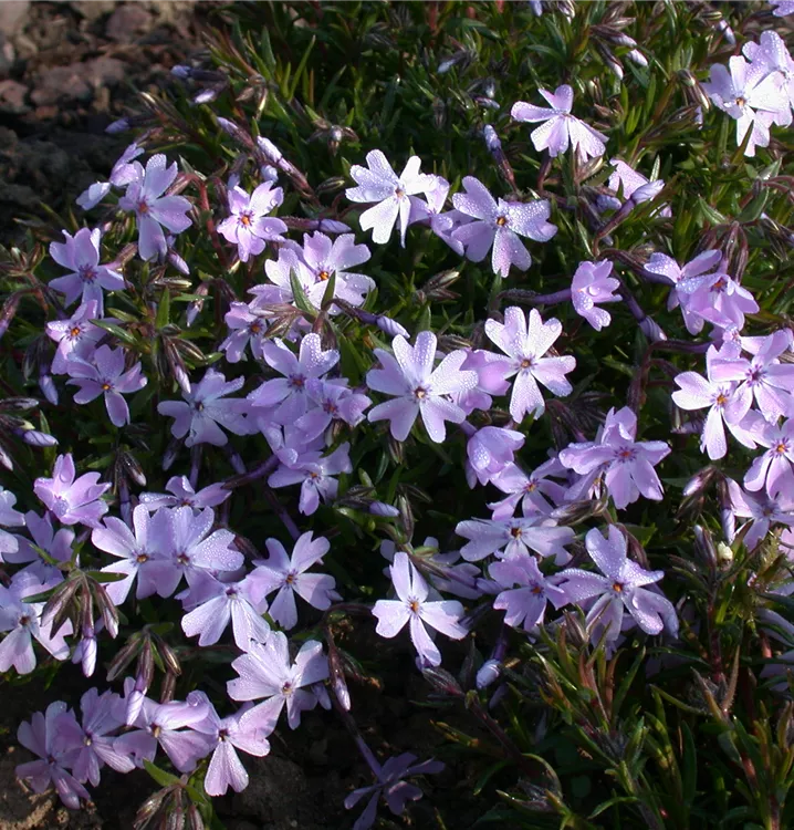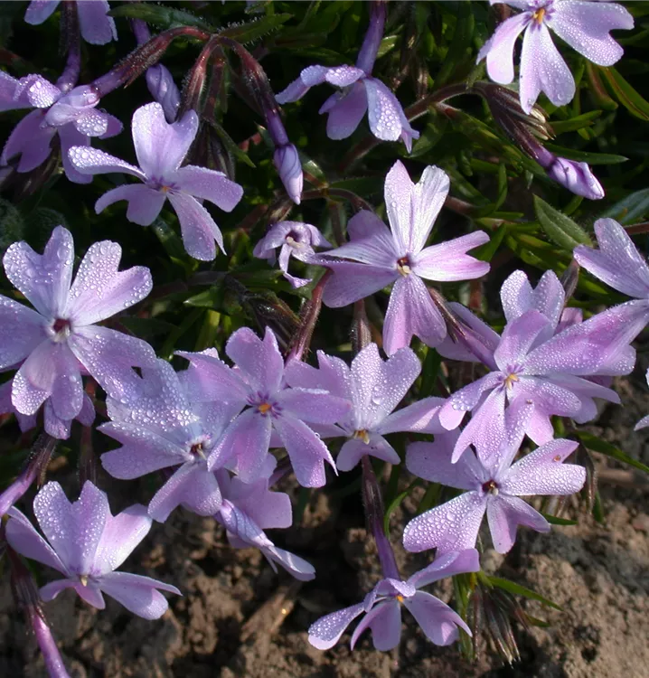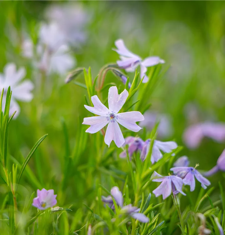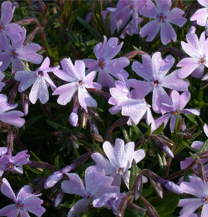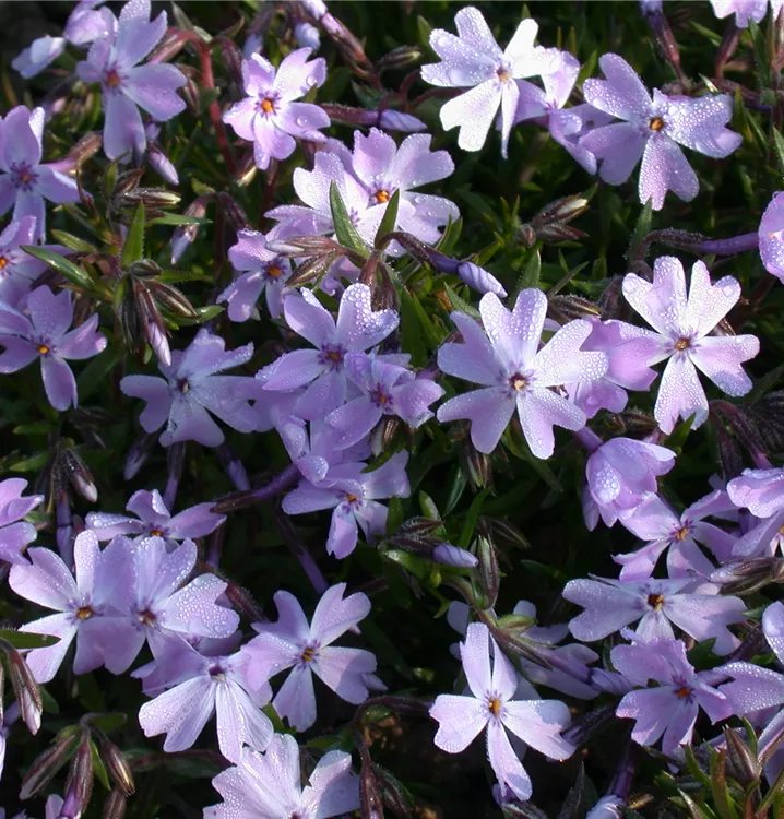 Phlox subulata 'Emerald Cushion Blue' bildet in Dolden angeordnete, lilafarbene Blüten ab April.