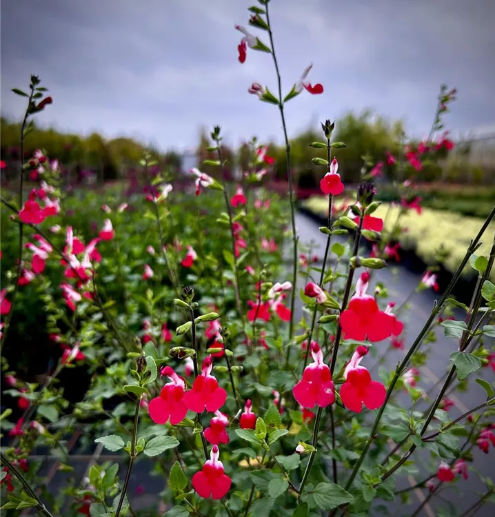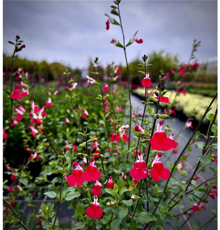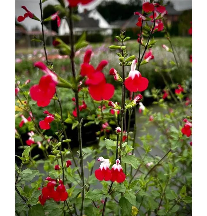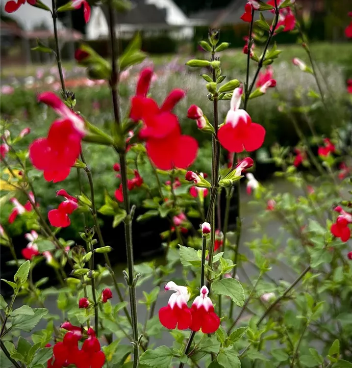Der Strauch-Salbei 'Hot Lips' (Salvia greggii) ist eine aufrechte immergrüne Staude, die von Juli bis Oktober scharlachrote Blüten mit einem angenehmen Duft bildet. An einem sonnigen, windgeschützten Standort mit durchlässigem, humosem, lockerem, sandigem Boden erreicht er gewöhnlich eine Höhe von ca. 60 cm und wird ca. 40 cm breit.